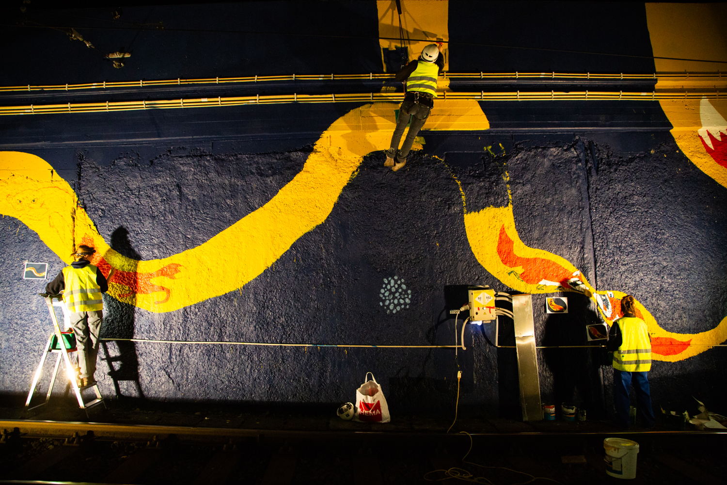 De kunstenaars hebben de fresco's de voorbije weken aangebracht, redelijk ongewoon nachtwerk.