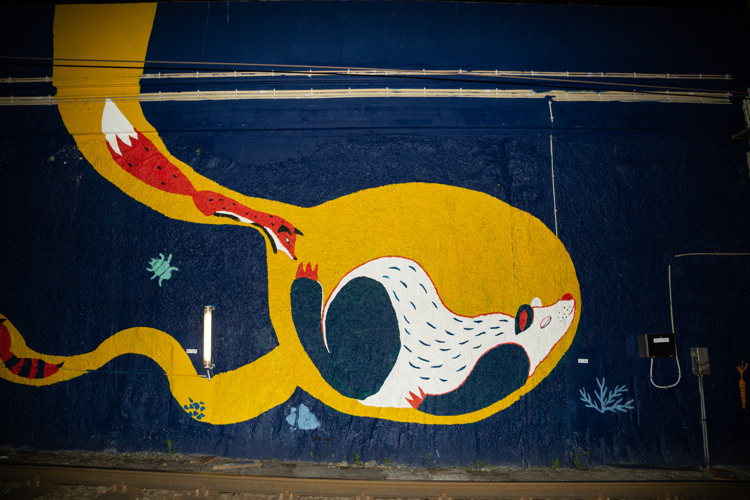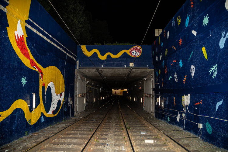 Collectief TAVU & LOUVES : "We hebben de buurtbewoners verschillende keren ontmoet die ons kwamen opzoeken, die ons hun mening gaven. Het was bemoedigend om te zien dat onze interventie positief voor hen was. Rechtstreeks op de sporen werken, aan de uitrit van een tramtunnel, was een unieke ervaring. Deze ruimte zorgt voor een zeer bijzonder sfeer en akoestiek. De plek heeft ons er ook toe aangezet om onze techniek te herbekijken, onder meer door 'herhalend' te schilderen."