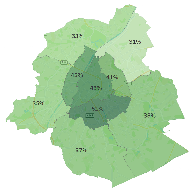 In tegenstelling met fietsen, openbaar vervoer of de auto schommelt het modaal aandeel van stappen weinig volgens leeftijd, geslacht of inkomen. Wel zijn er geografische verschillen: er wordt meer gestapt in de gemeenten van de eerste kroon dan in de verder afgelegen tweede kroon. Dat valt te verklaren doordat de afstanden in en rond het centrum korter zijn.
