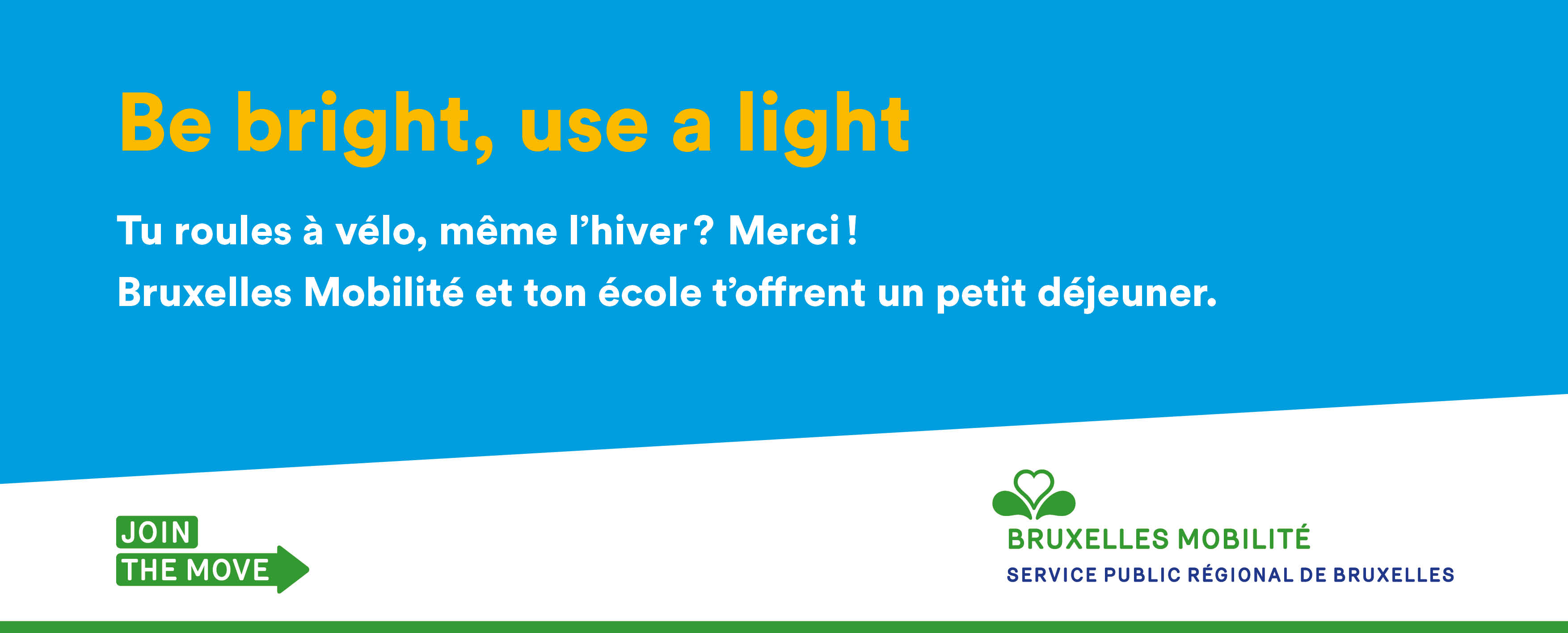 Bruxelles Mobilité souhaite remercier les usagers qui continuent à se déplacer à pied et à vélo même pendant les mois froids et sombres. Nous organisons l'action « Be Bright » pour 50 écoles bruxelloises. Plus de 1500 élèves et enseignants de ces écoles ont manifesté leur intention de continuer à se rendre à l'école à vélo même en automne et hiver. Nous les remercions en leur offrant un petit-déjeuner le 16 octobre et leur fournissant des kits d'éclairage.