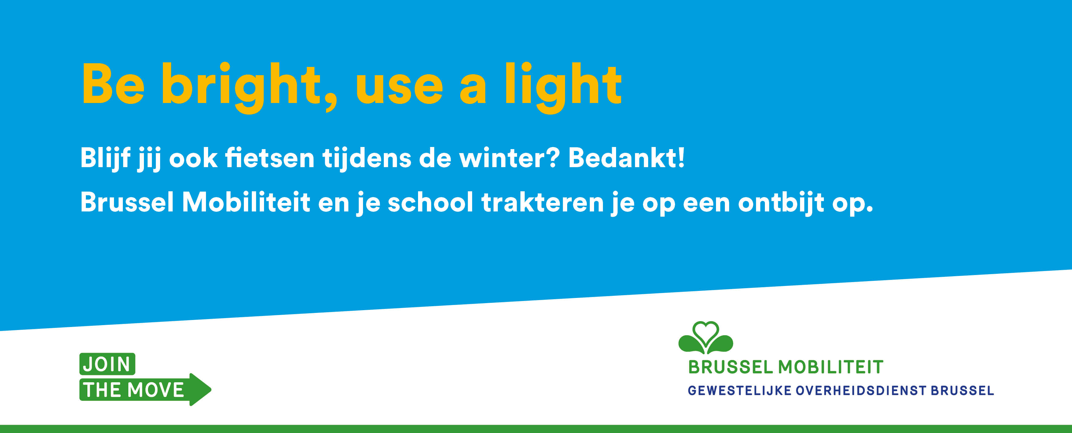 Brussel Mobiliteit wil alle weggebruikers die ook tijdens koude en donkere maanden te voet of met de fiets blijven gaan bedanken. Met de actie “Be Bright” voor 50 Brusselse scholen heben meer dan 1.500 leerlingen en leerkrachten van deze scholen aangegeven dat ze ook in de herfst en winter met de fiets naar school willen blijven komen. Als bedanking krijgen ze op 16 oktober een ontbijt en verlichtingssets aangeboden.